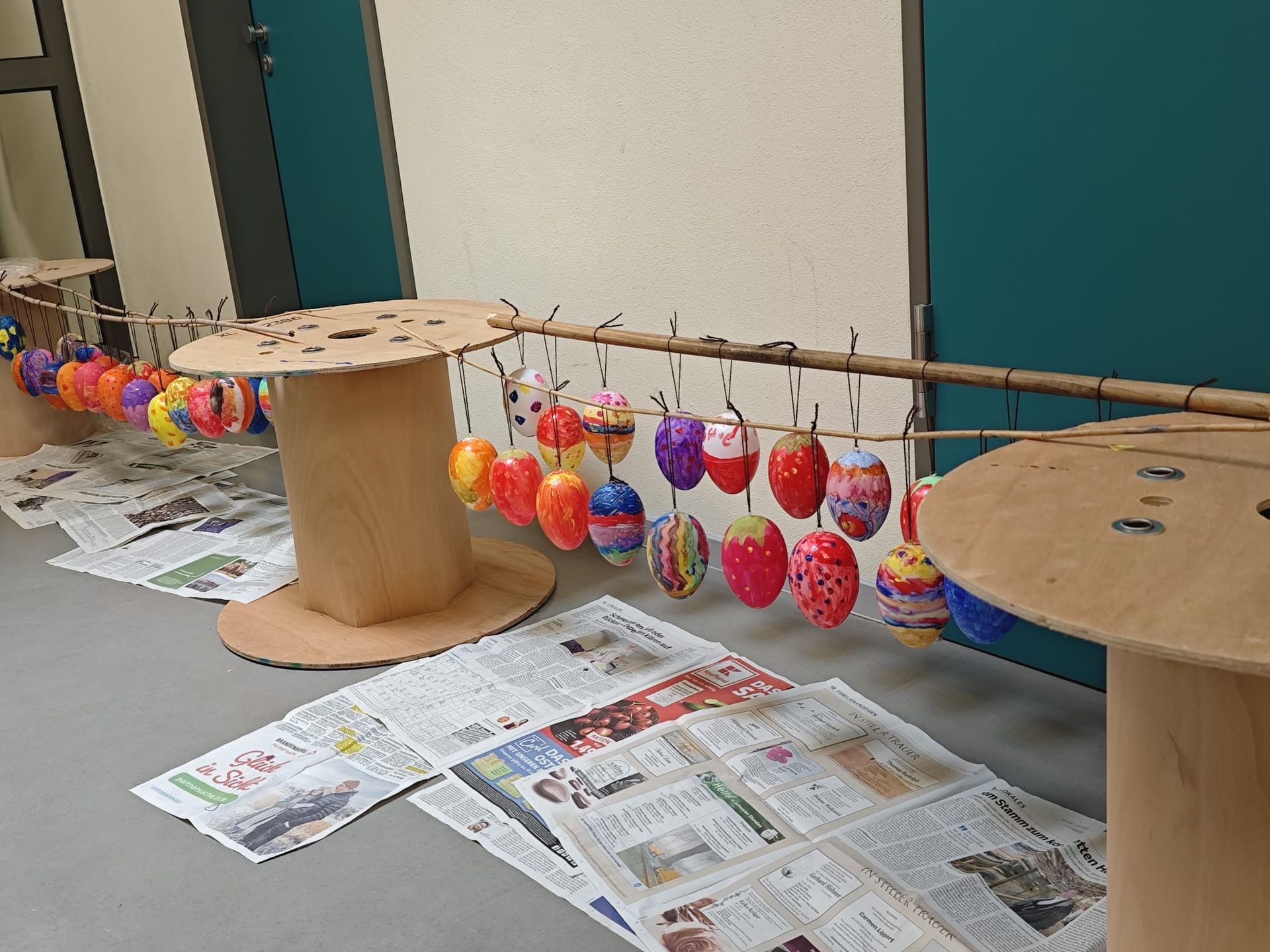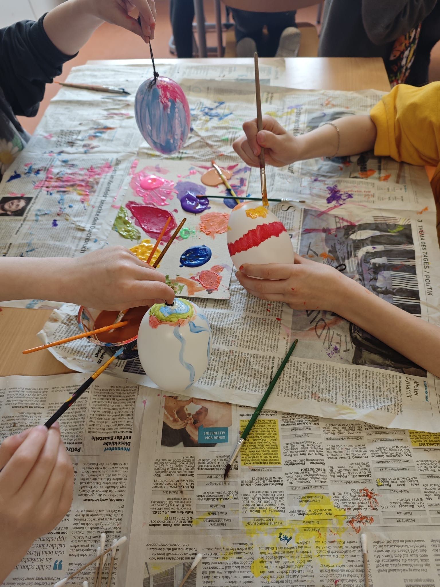 Gemeinsam haben die Klassen 2b & 6a sowie die Klassen 2c & 5a vor den Osterferien noch Ostereier bemalt und das Grundstück, den Brandenburger Platz sowie den Stadtteil damit geschmückt.