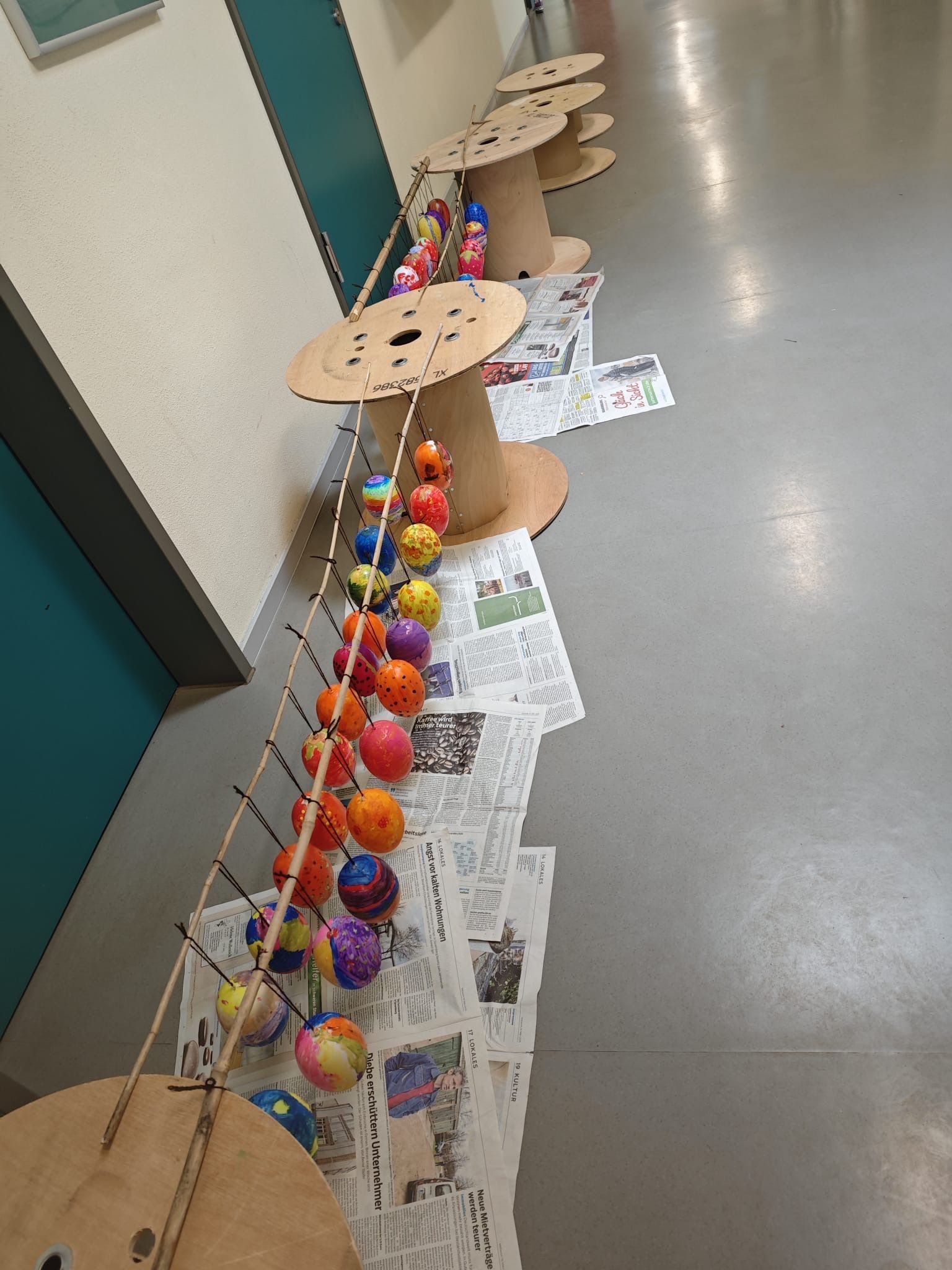 Gemeinsam haben die Klassen 2b & 6a sowie die Klassen 2c & 5a vor den Osterferien noch Ostereier bemalt und das Grundstück, den Brandenburger Platz sowie den Stadtteil damit geschmückt.
